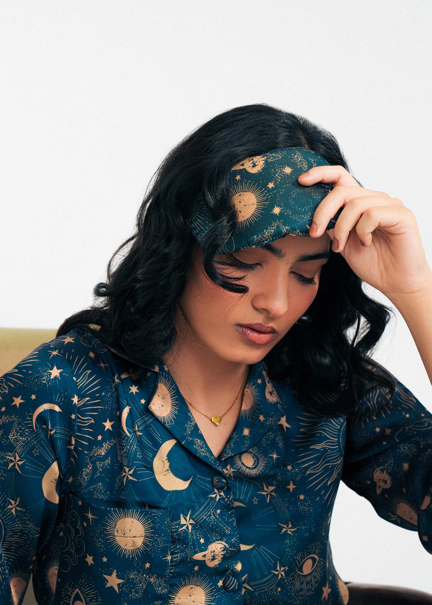 Product Description: An all-over printed PJ set adorned with moons and stars, featuring a classic collared shirt and matching eye mask — dreamy, celestial, and perfectly cozy.