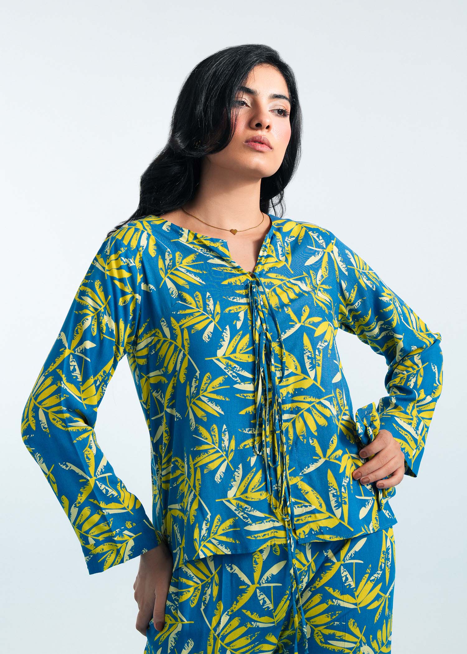 Product Description: A printed all-over PJ set paired with a matching eye mask, adorned with front bows and coordinated trousers — a charming blend of comfort and elegance.