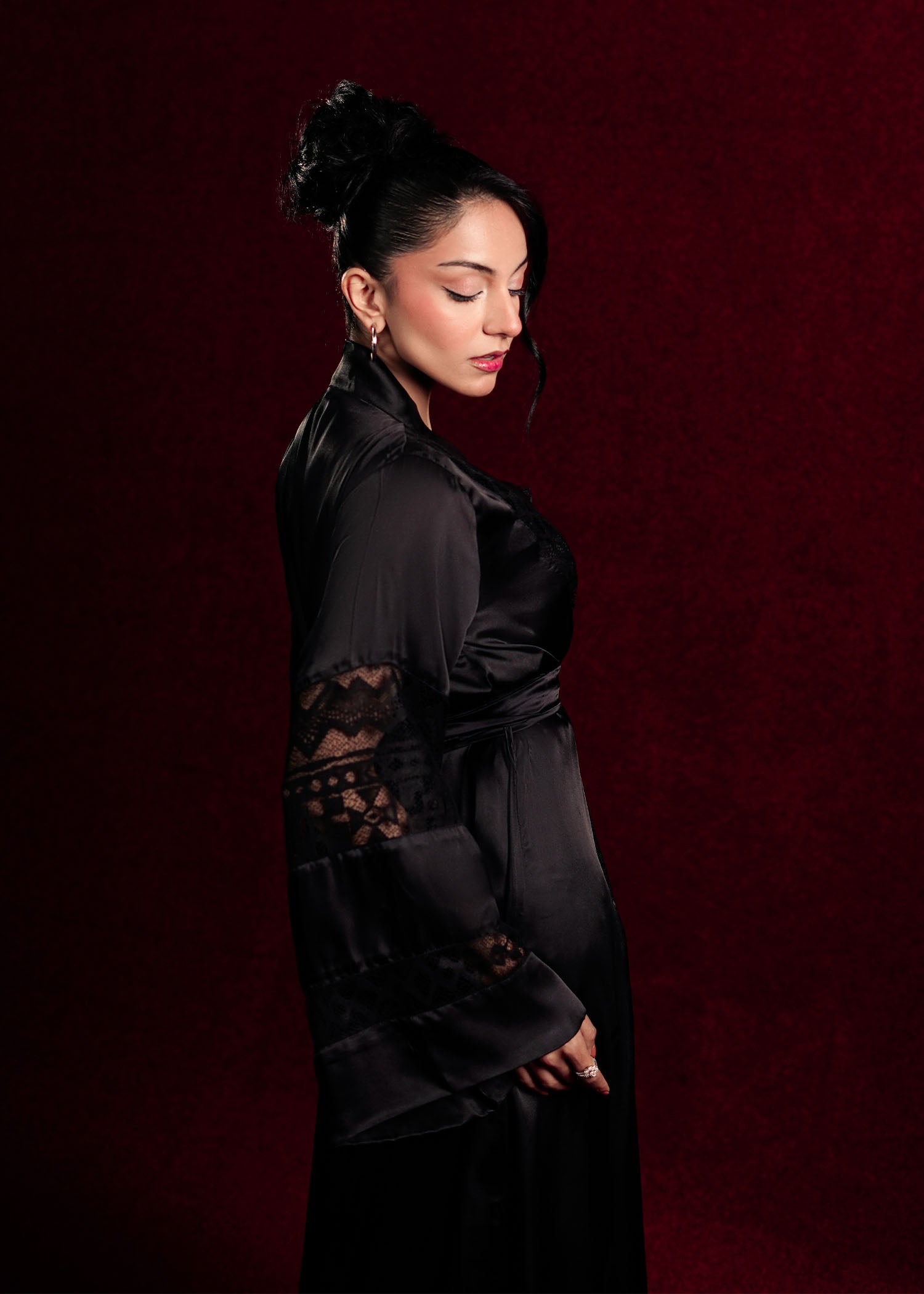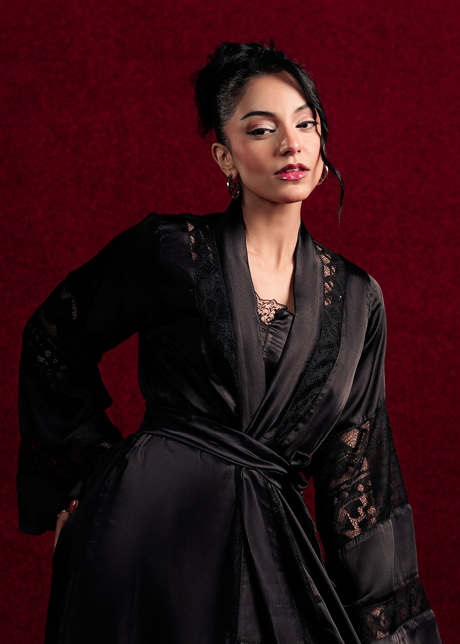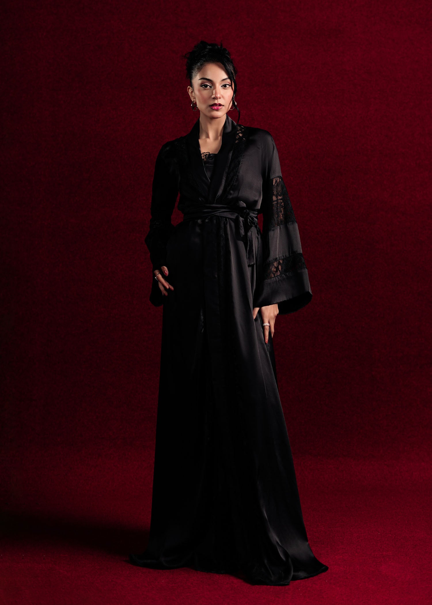 A classic black night gown designed with subtle textures and graceful draping. Perfect for unwinding in style while feeling luxuriously at ease.