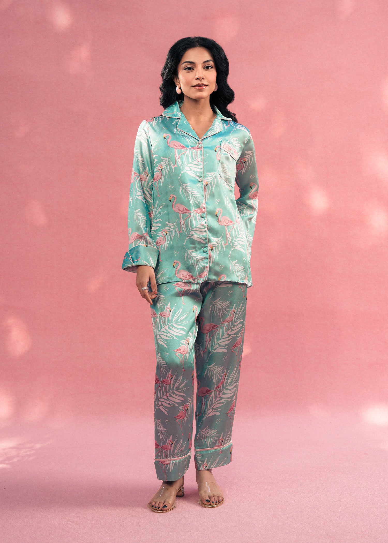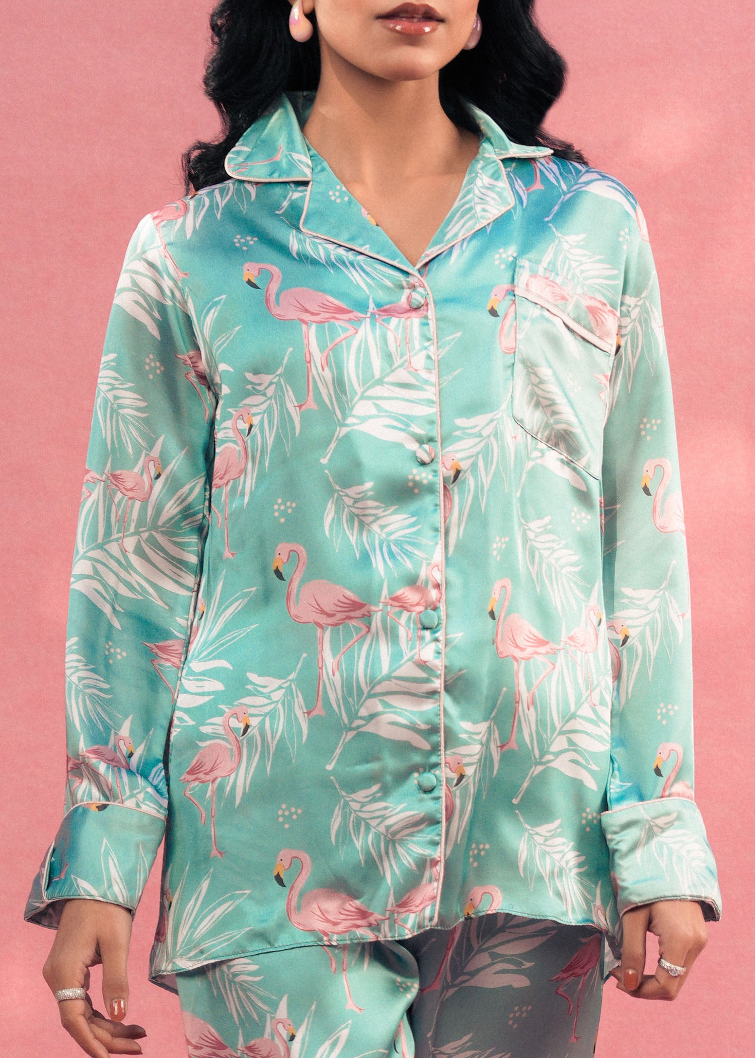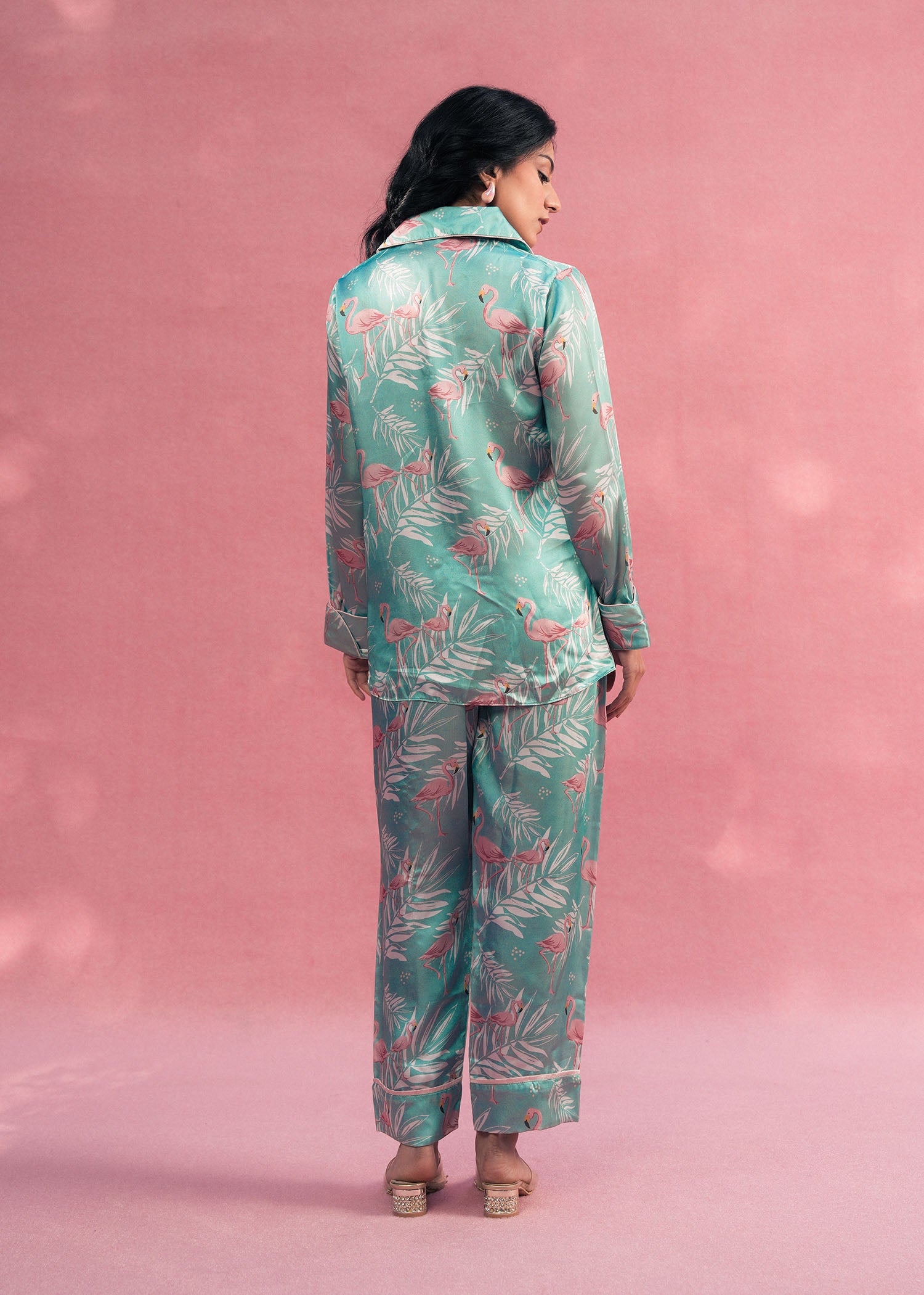 Bring elegance and nature together with Larosa’s sea green silk PJ set, featuring graceful flamingo-inspired prints. Crafted from smooth, luxurious silk