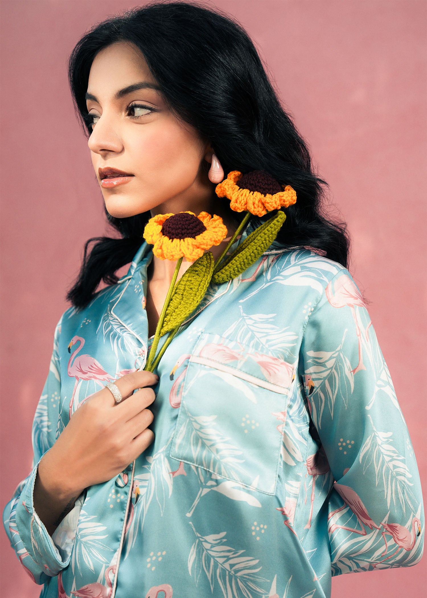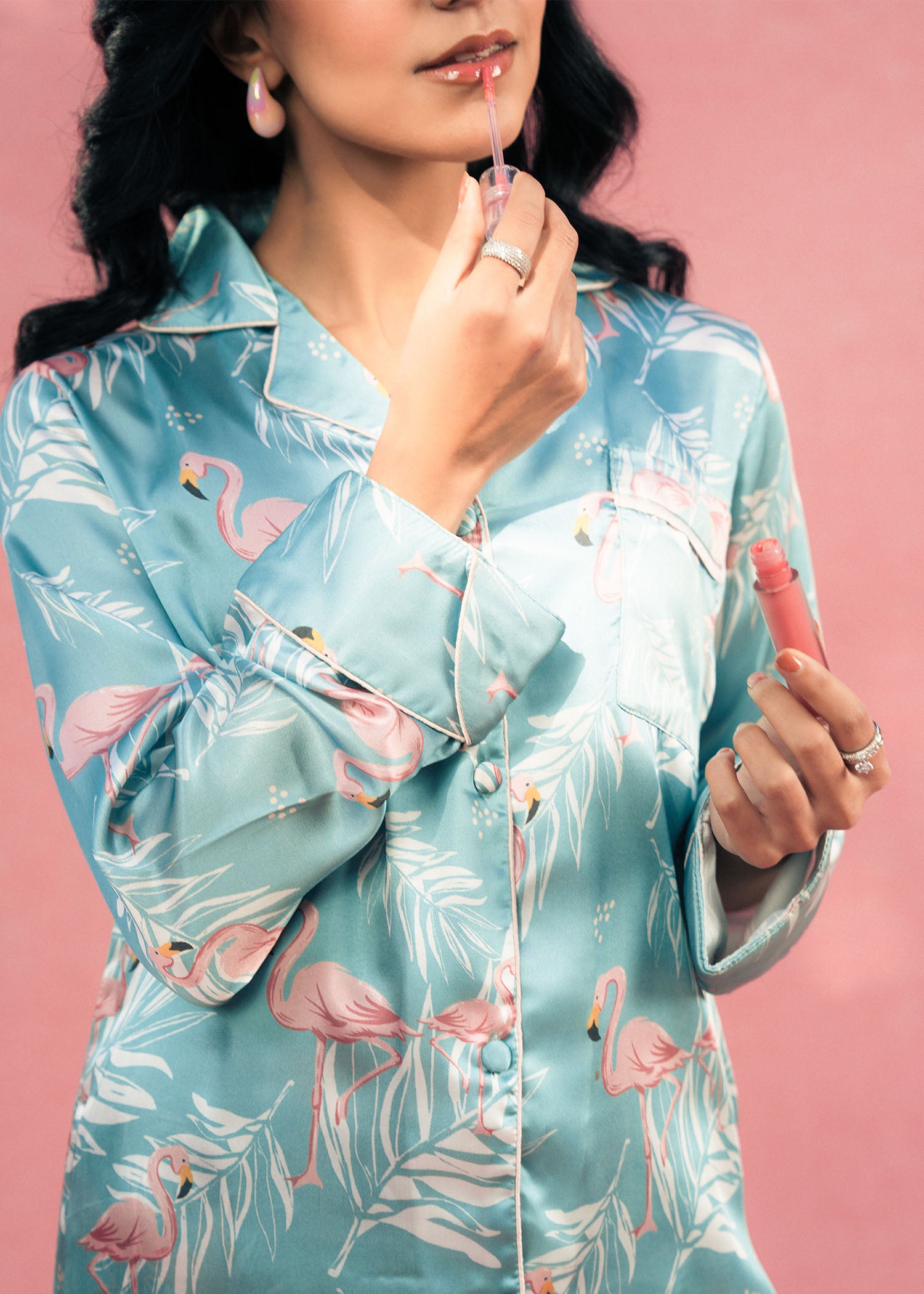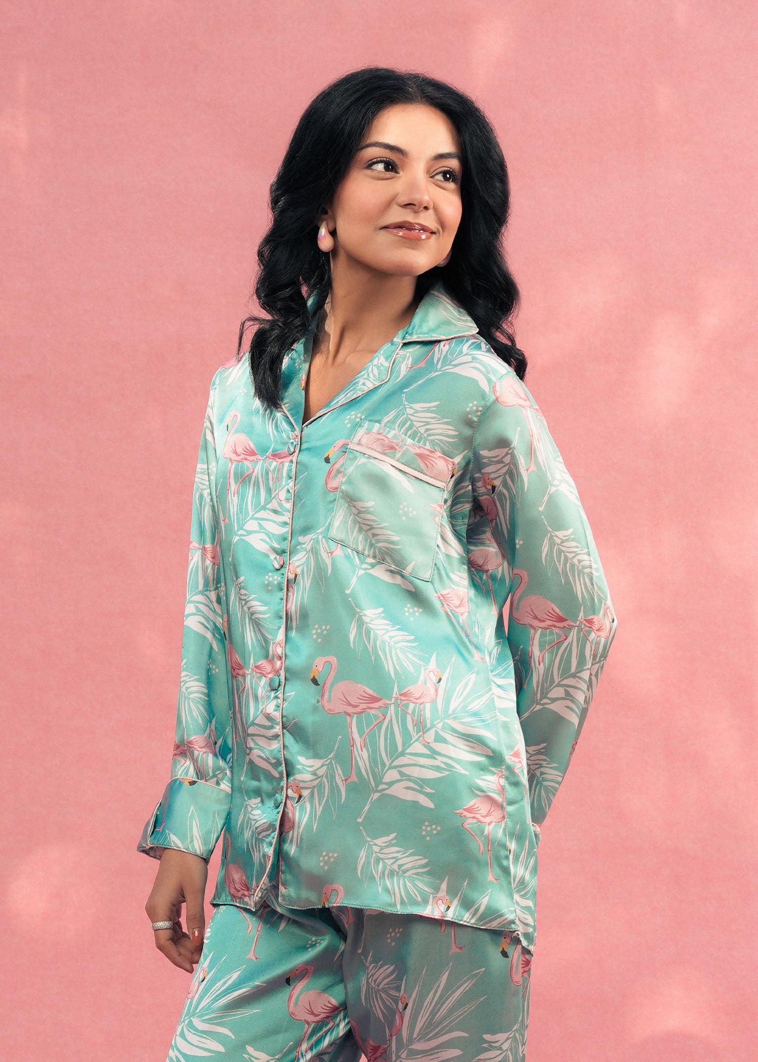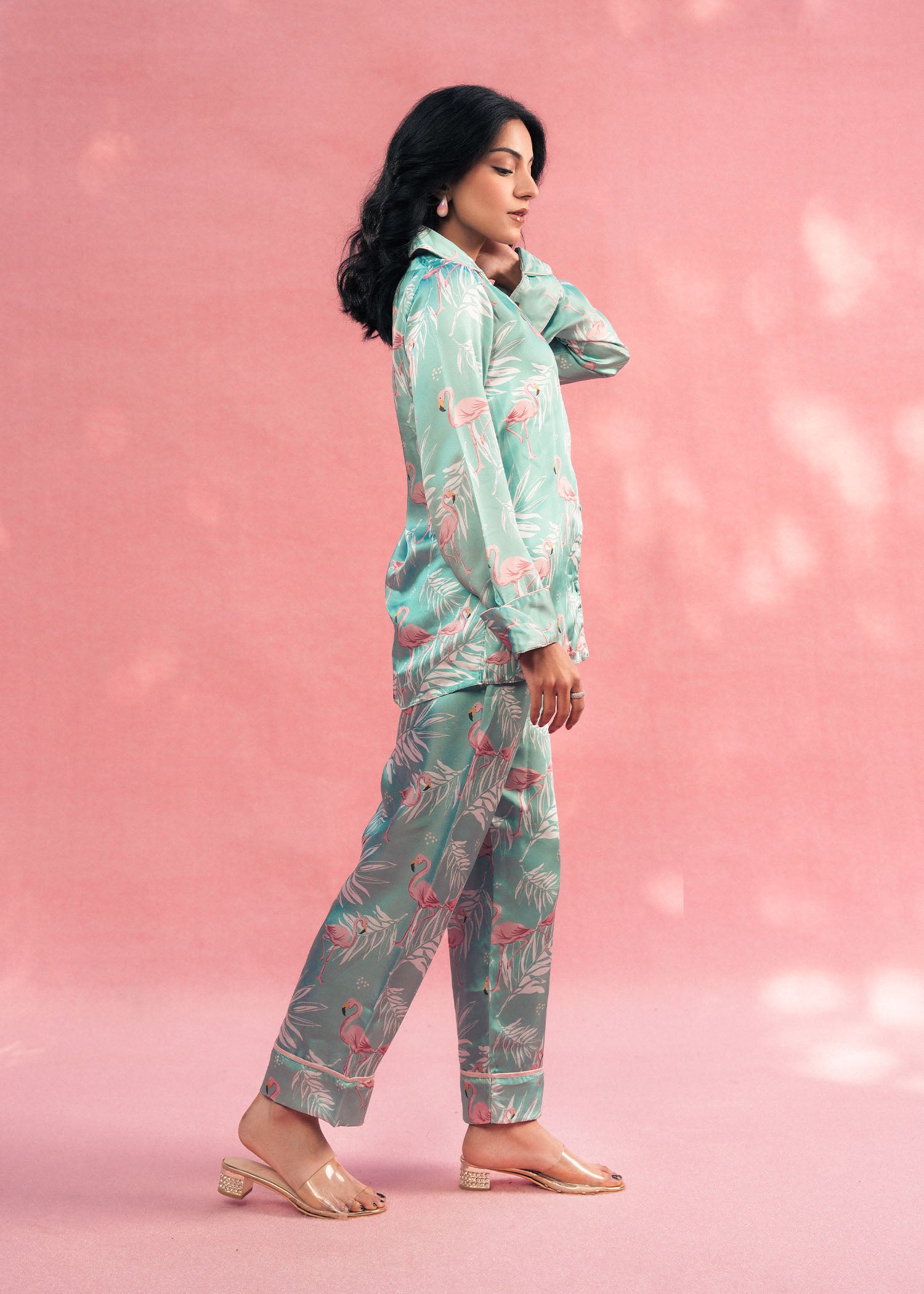 Bring elegance and nature together with Larosa’s sea green silk PJ set, featuring graceful flamingo-inspired prints. Crafted from smooth, luxurious silk