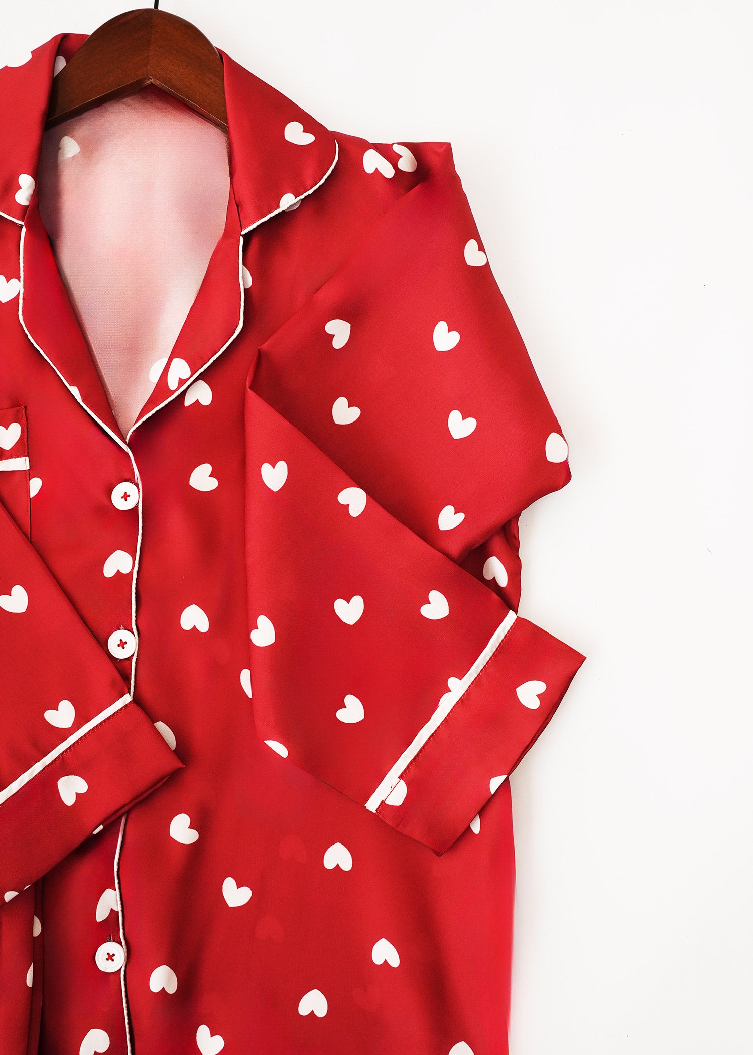 Wrap yourself in comfort with the Heartfelt Bliss PJ Set—a soft red silk pajama set with white heart prints. Lightweight, breathable, and cozy, this set is designed for the Valentine season, making it perfect for a relaxing night in.