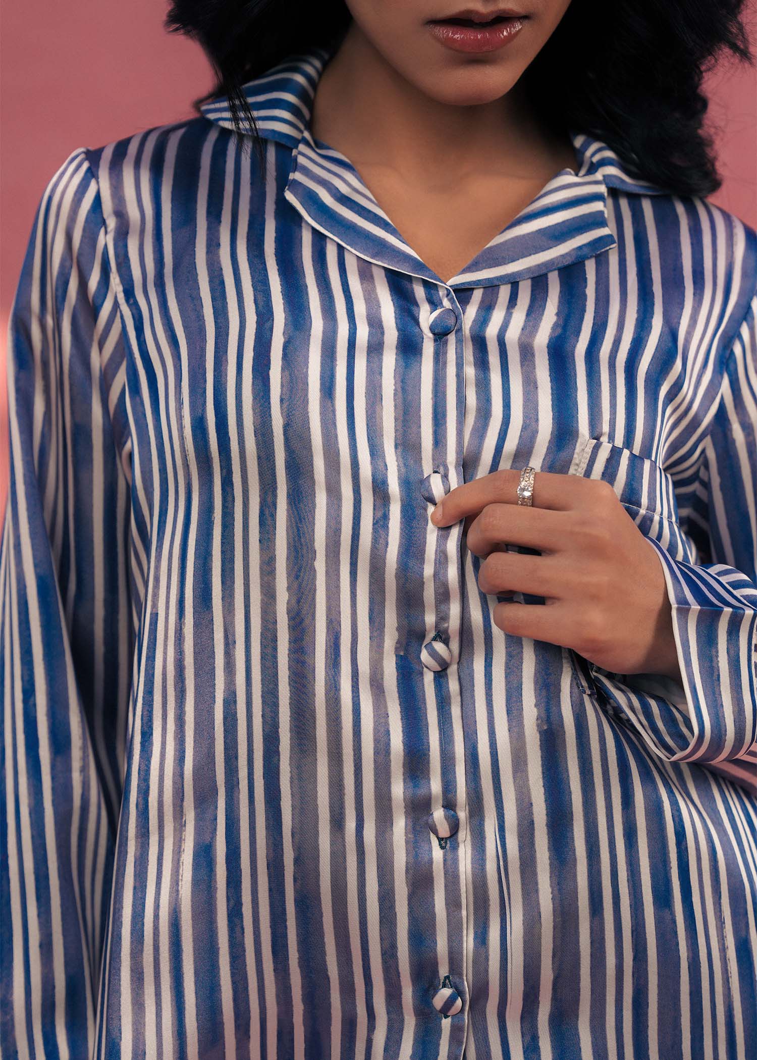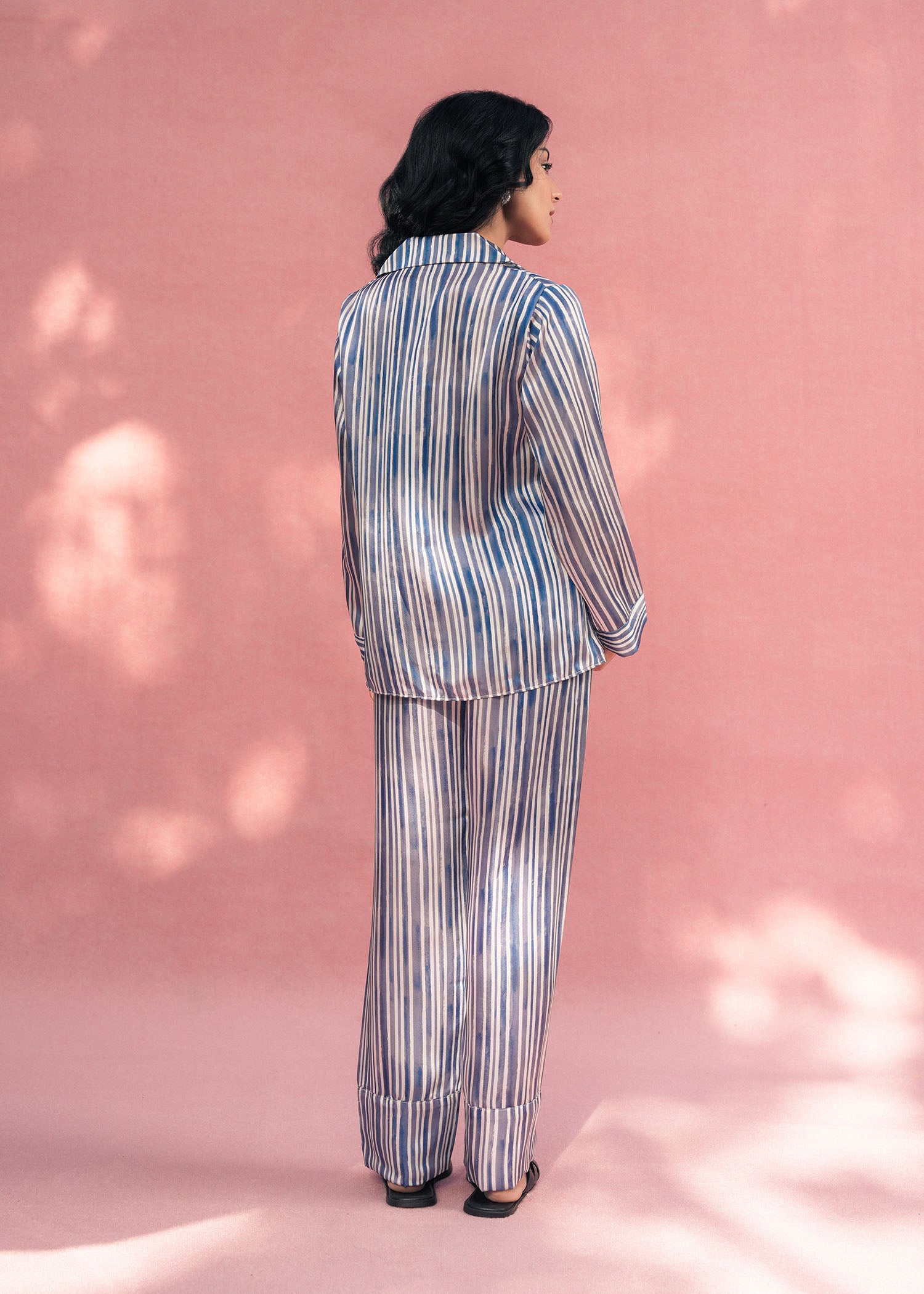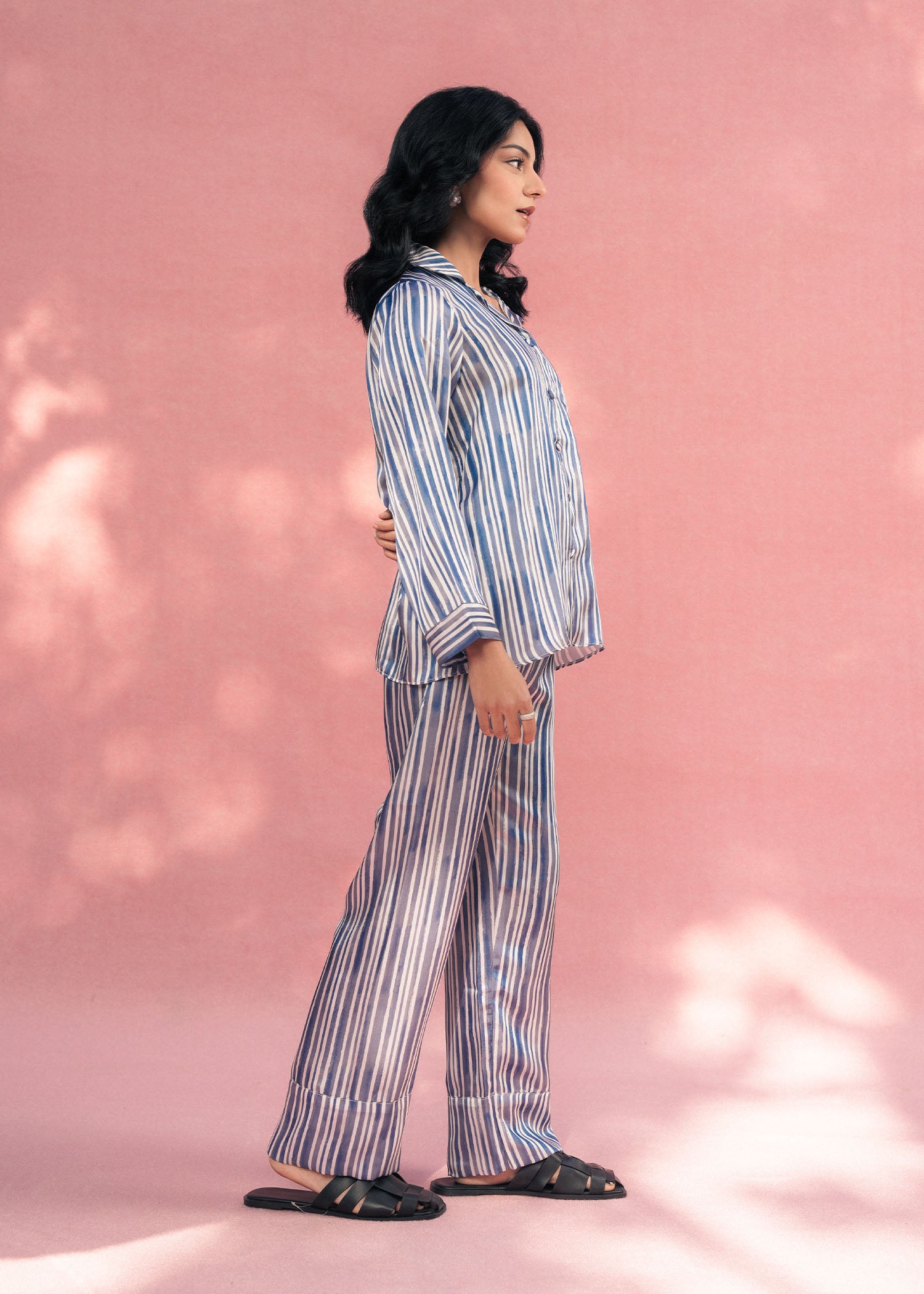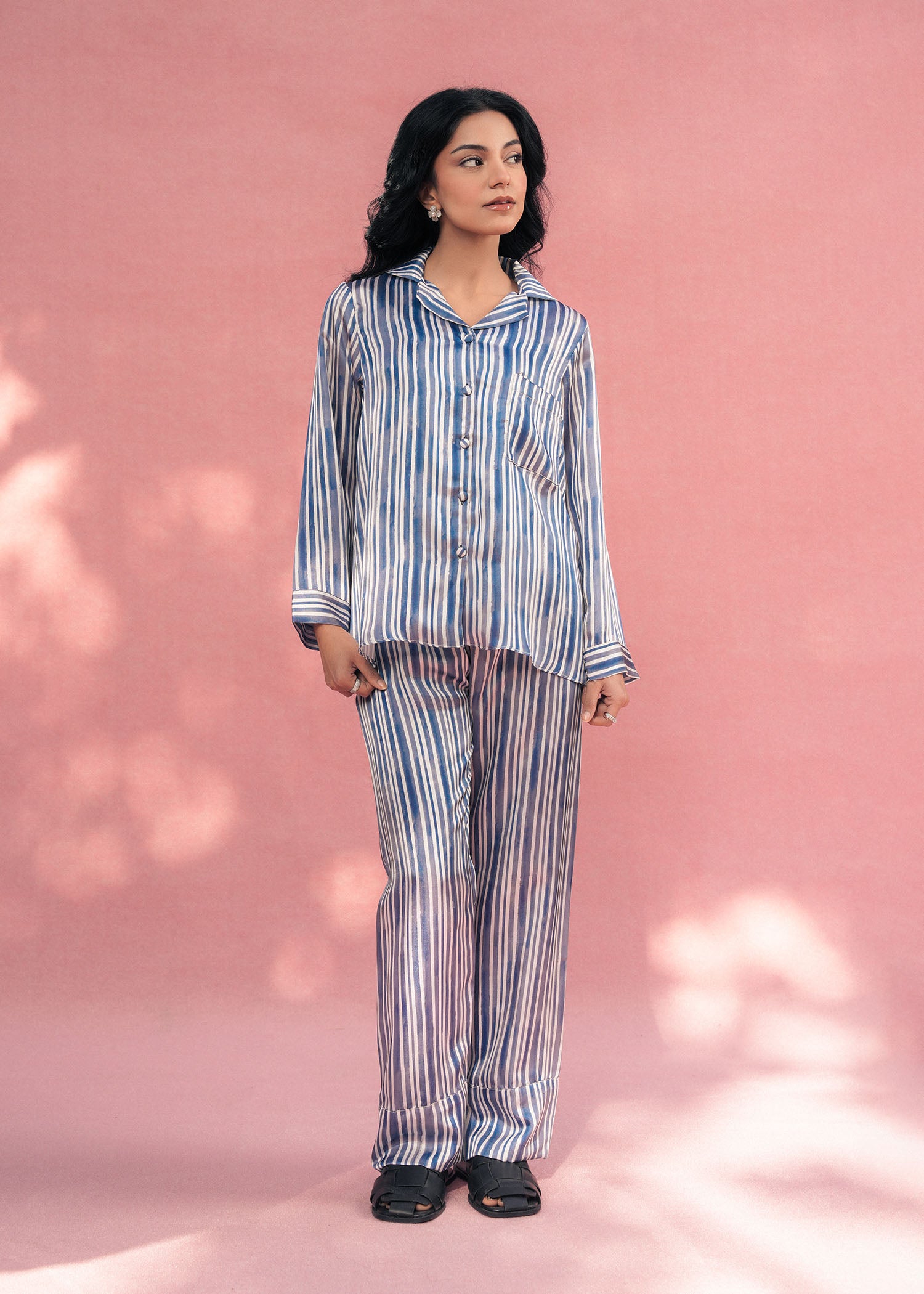 The set features a button-down shirt and straight-fit trousers highlighted with a timeless vertical stripe print. The cool blue tone combined with clean stripes creates a calm, refined look that is both stylish and soothing.