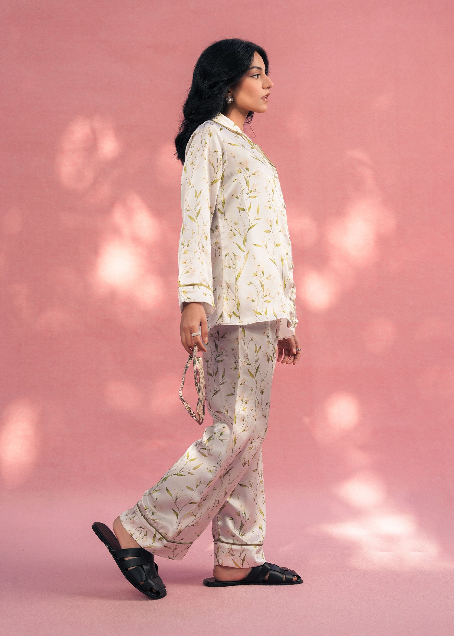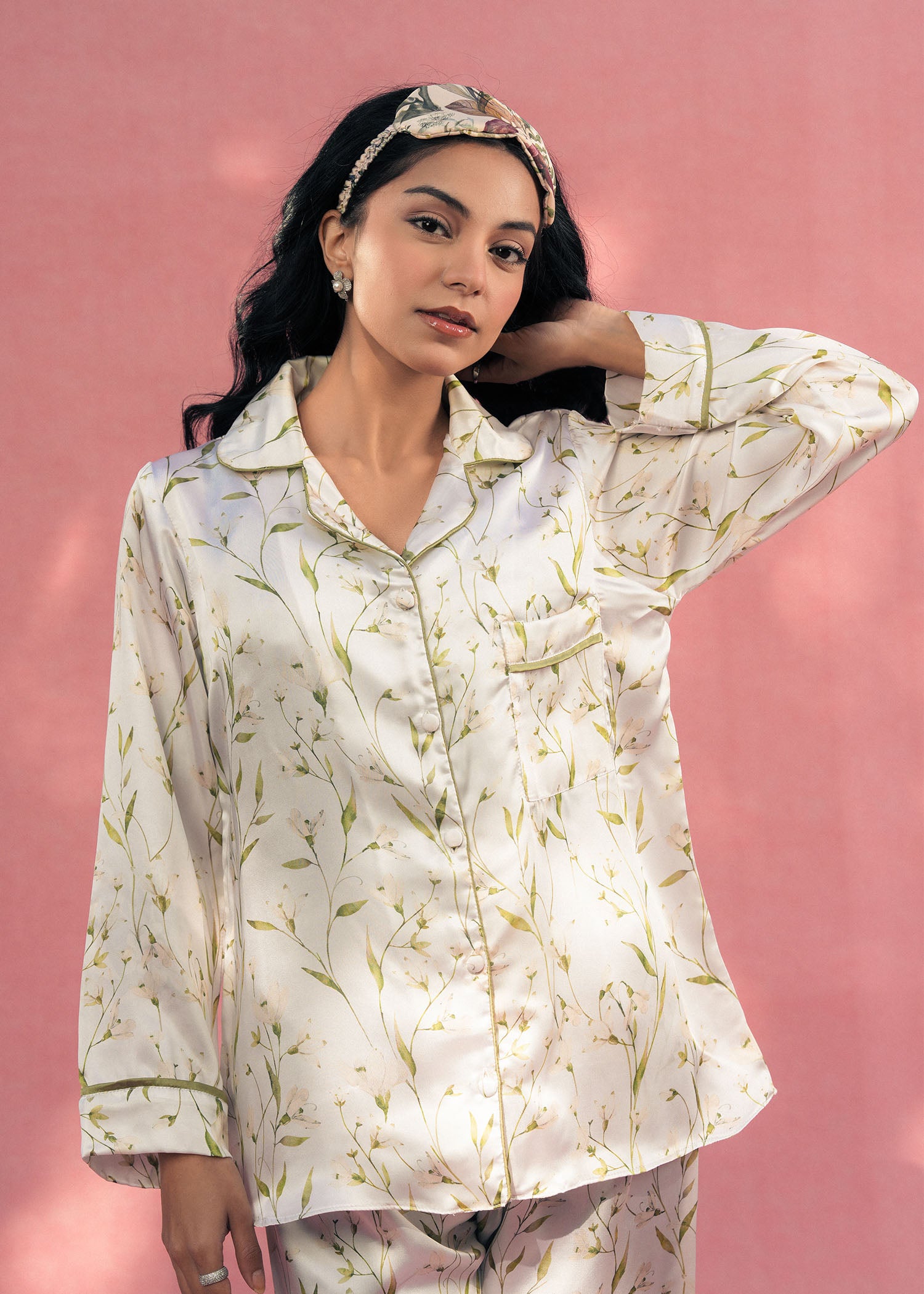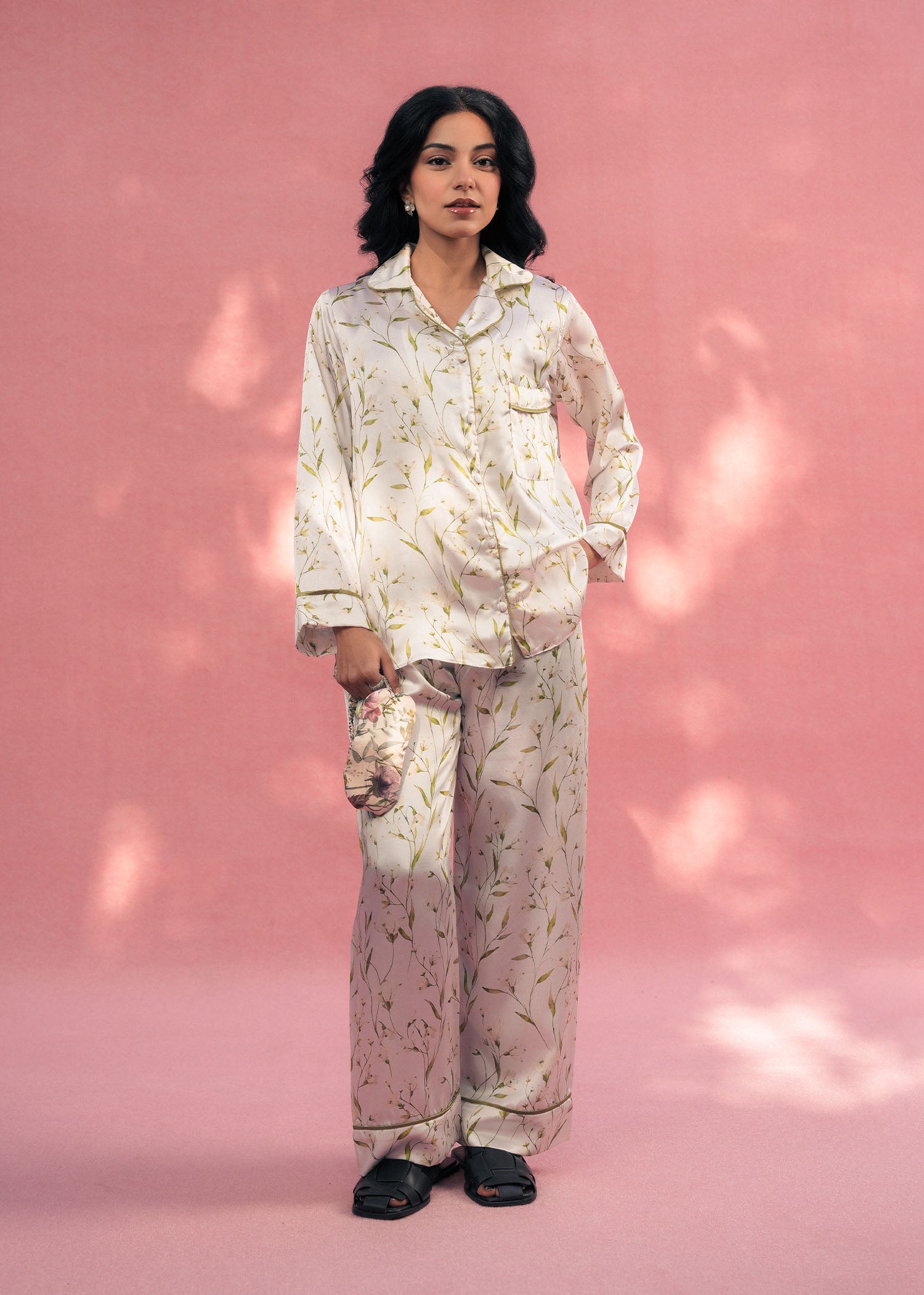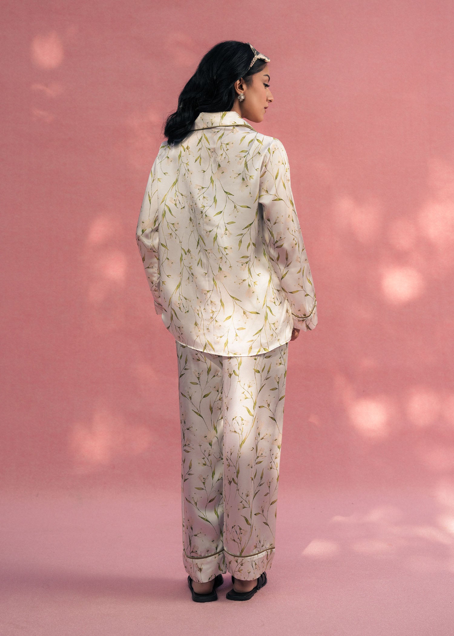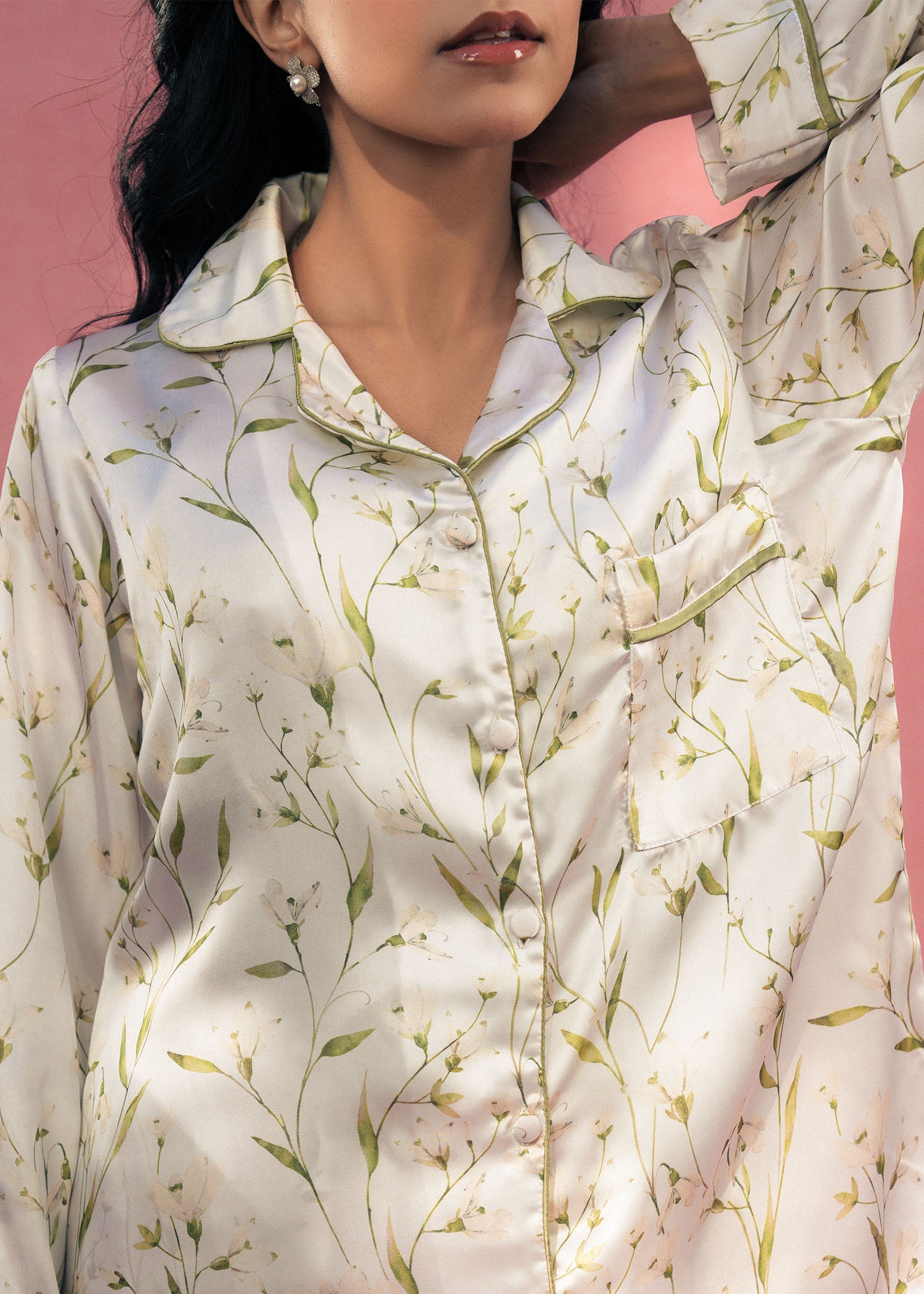 A luxurious white silk PJ set featuring a delicate botanical print. Designed for ultimate comfort with a soft, smooth feel and a timeless, relaxed fit.