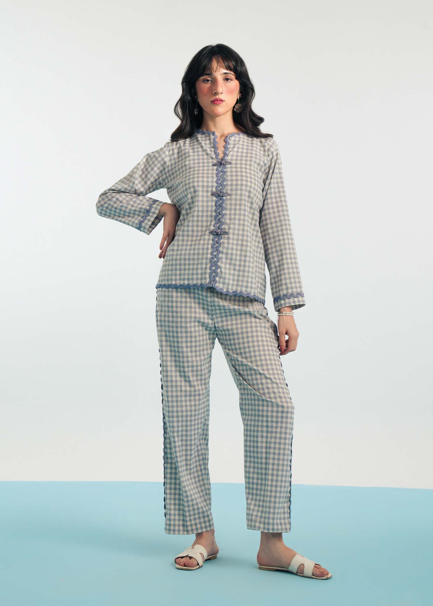 Product Description: A basic printed PJ set featuring front buttons, piped cuffs, and matching trousers — simple, elegant, and made for everyday comfort.