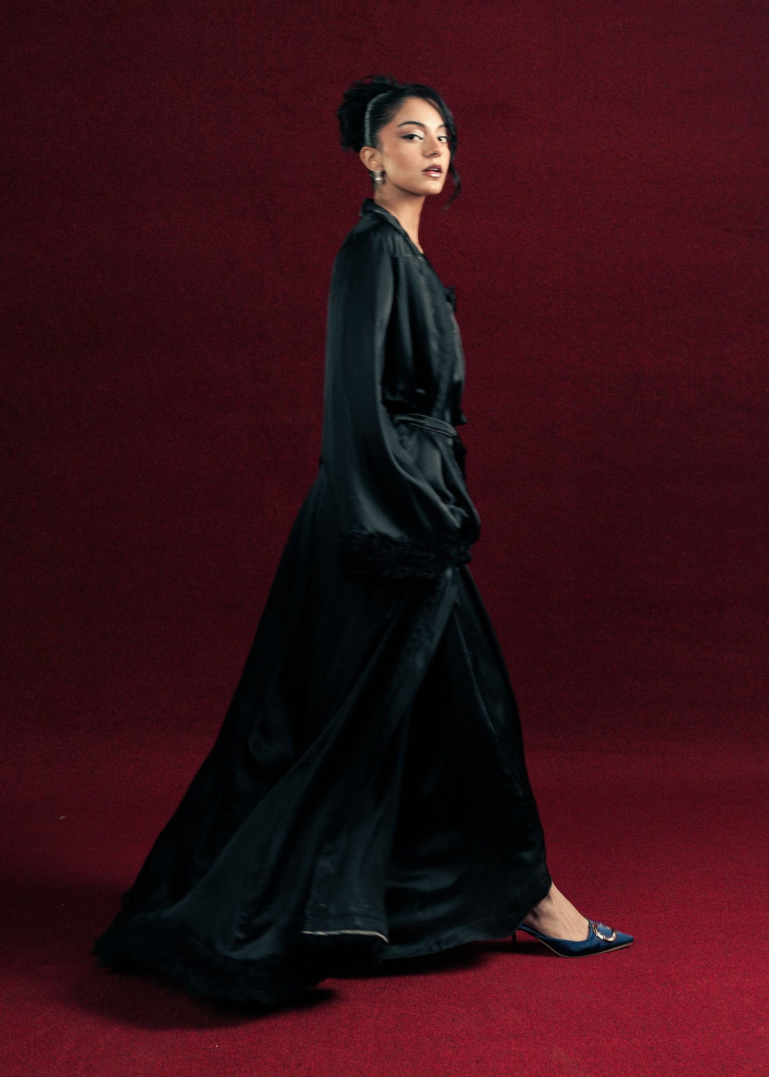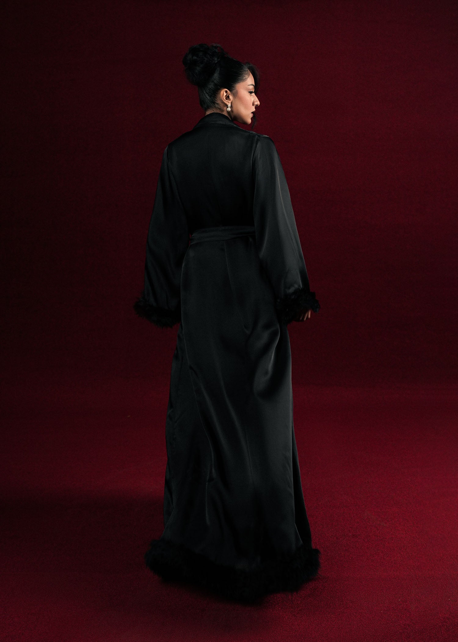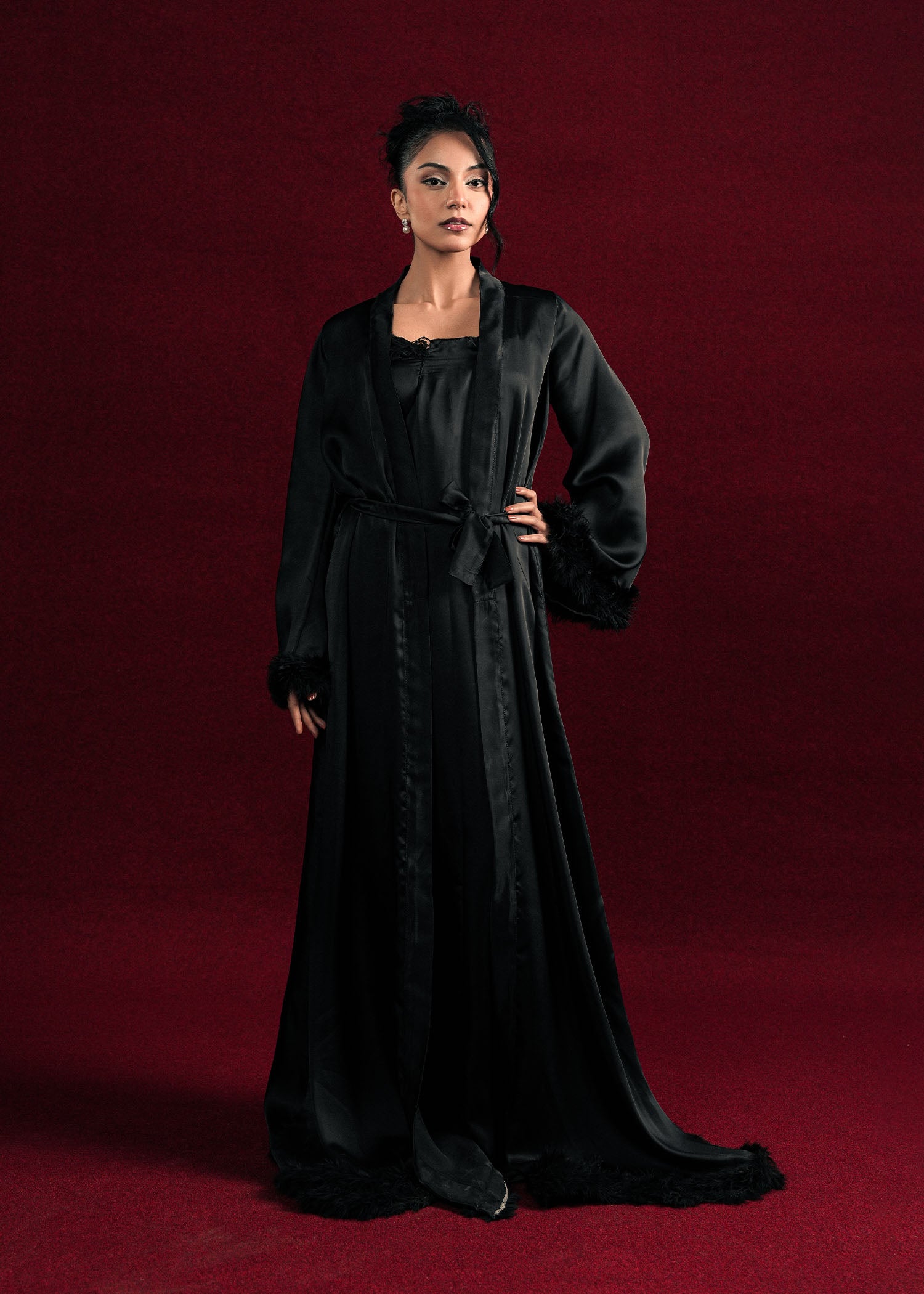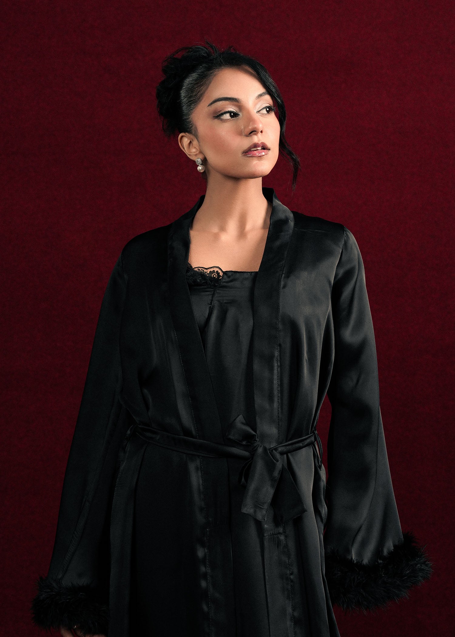 Black silk night gown is designed for understated luxury and feather-trimmed cuffs for a refined finish.