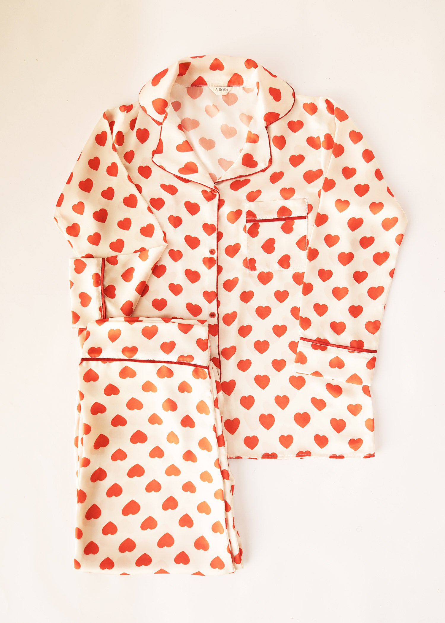The Romantic Whispers PJ Set is made from soft white silk with delicate heart prints. Light, breathable, and comfortable, it's perfect for cozy nights and Valentine’s moments.