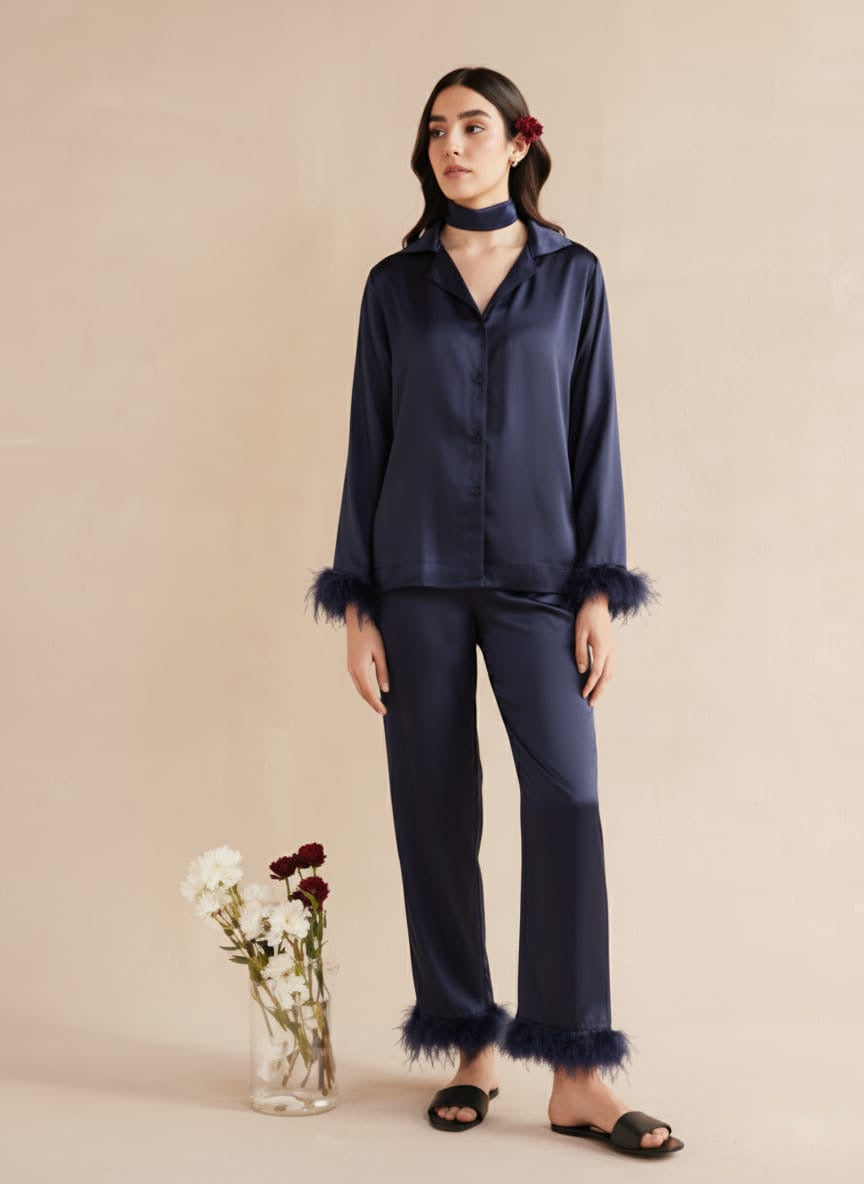 The satin navy blue silk PJ set is the epitome of luxury, featuring soft silk fabric and cozy fur around the cuffs for an extra touch of elegance. This stunning set blends warmth and style, making it perfect for relaxing in comfort while looking effortlessly elegant.