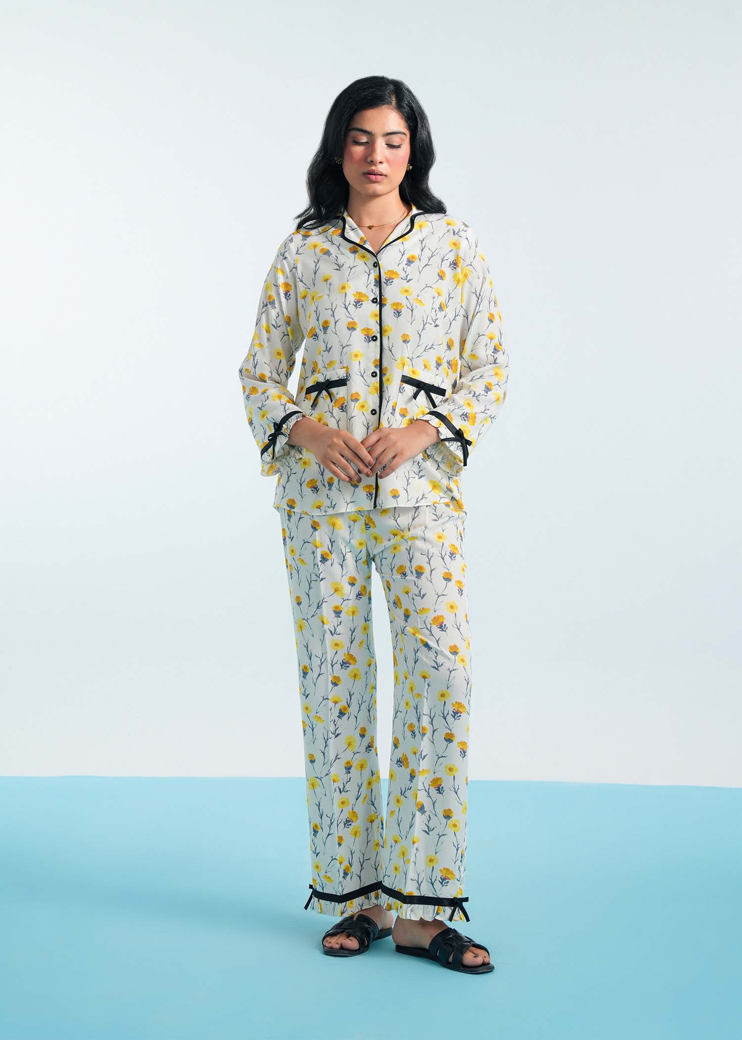 Product Description: A lively all-over printed PJ set adorned with yellow florals, finished with contrast piping along the collar, cuffs, and trouser hems — cheerful, refined, and made for cozy mornings.
