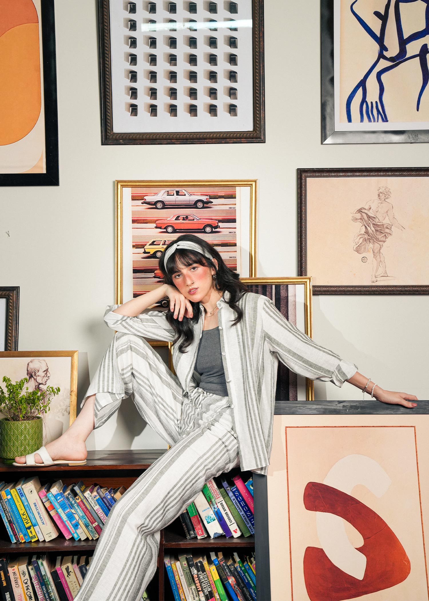 Product Description: A grey linen PJ set featuring a classic collared shirt and matching trousers — minimal, breathable, and timelessly elegant.